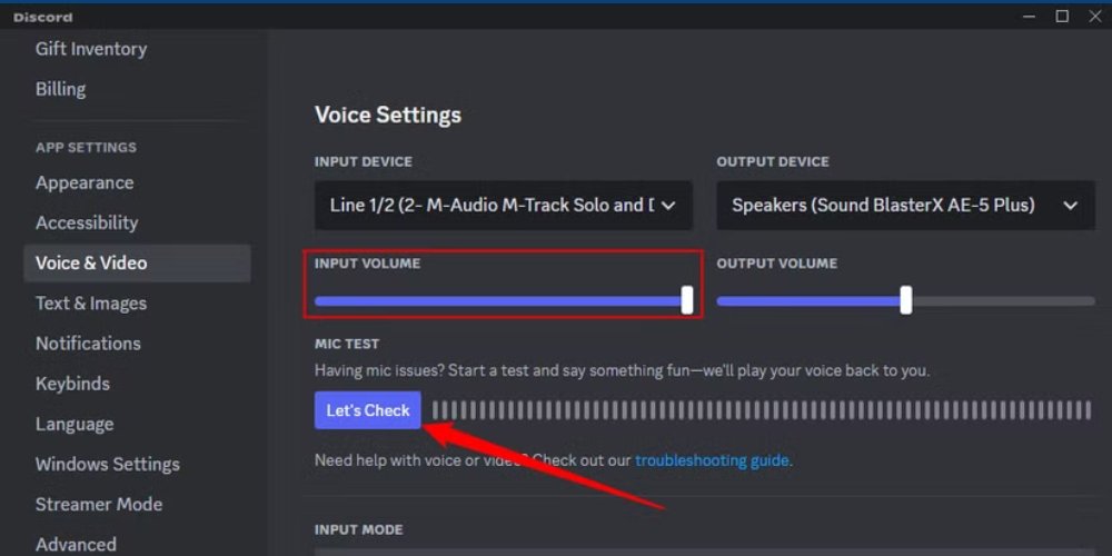 2. Go to the User Settings and then Voice and Video > Voice tab for input settings.