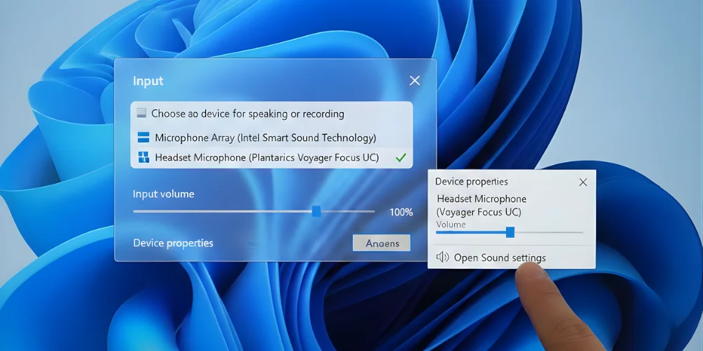 There, you can select the open sound settings. Now, click on the input drop-down and select Plantronics headsets as the default. Also, make sure that the volume is not set to a lower level in the slider in Device Properties.