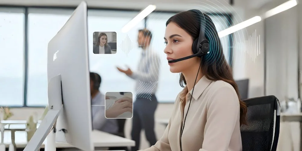 The leatherette earcups sit on your ears to provide passive noise cancellation. You will sound clear to the people on the call, as it will block out the noises like keyboard clatter, human speech, or sudden office chatter.