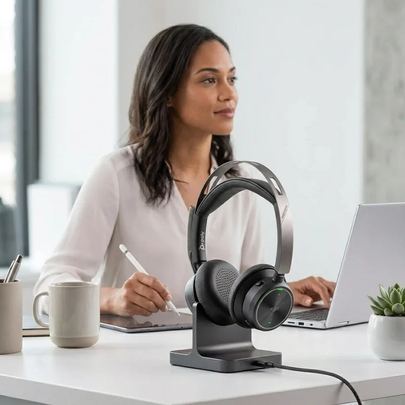 The Poly Voyager Focus 2 headsets can also be used with the charging stand and support fast charging. Through these headsets stay organized and keep your desk mess-free. In addition, they stay ready for use all the time.